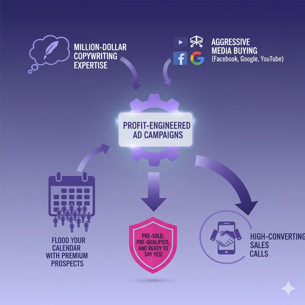 We combine million-dollar copywriting expertise with aggressive media buying across Facebook, Google & YouTube to flood your calendar with premium prospects who are pre-sold, pre-qualified, and ready to say yes before they ever jump on a call with you.