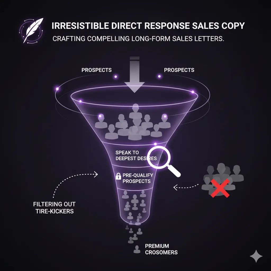 We pre-qualify your prospects before they ever reach you by crafting compelling long form sales letters that speak directly to your ideal customers' deepest desires & automatically filter out tire-kickers who can't afford your premium offer.