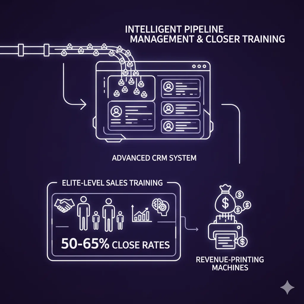 You receive unlimited access to our advanced CRM system with a pipeline we keep overflowing with high-intent prospects daily, plus elite-level sales training that equips your closers to achieve 50-65% close rates on stone-cold leads, performance metrics that turn sales teams into revenue-printing machines.